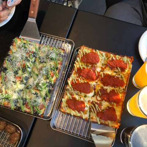 네모난 피자를 판매하고 있는