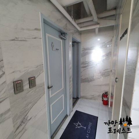 2층 안쪽에 보이는 화장실 입구 (+ 내부도 깔끔해요)