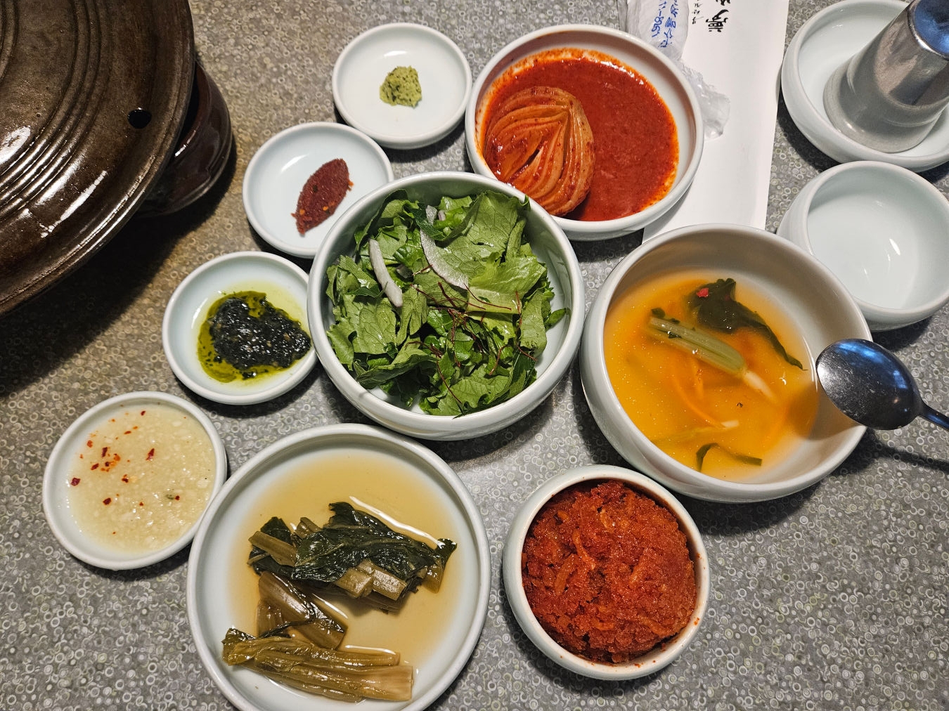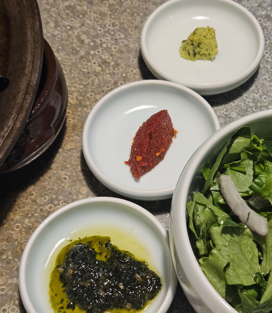 마늘 base, 깻잎 base 소스가 놓여져 있다.