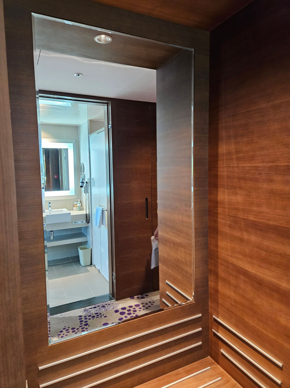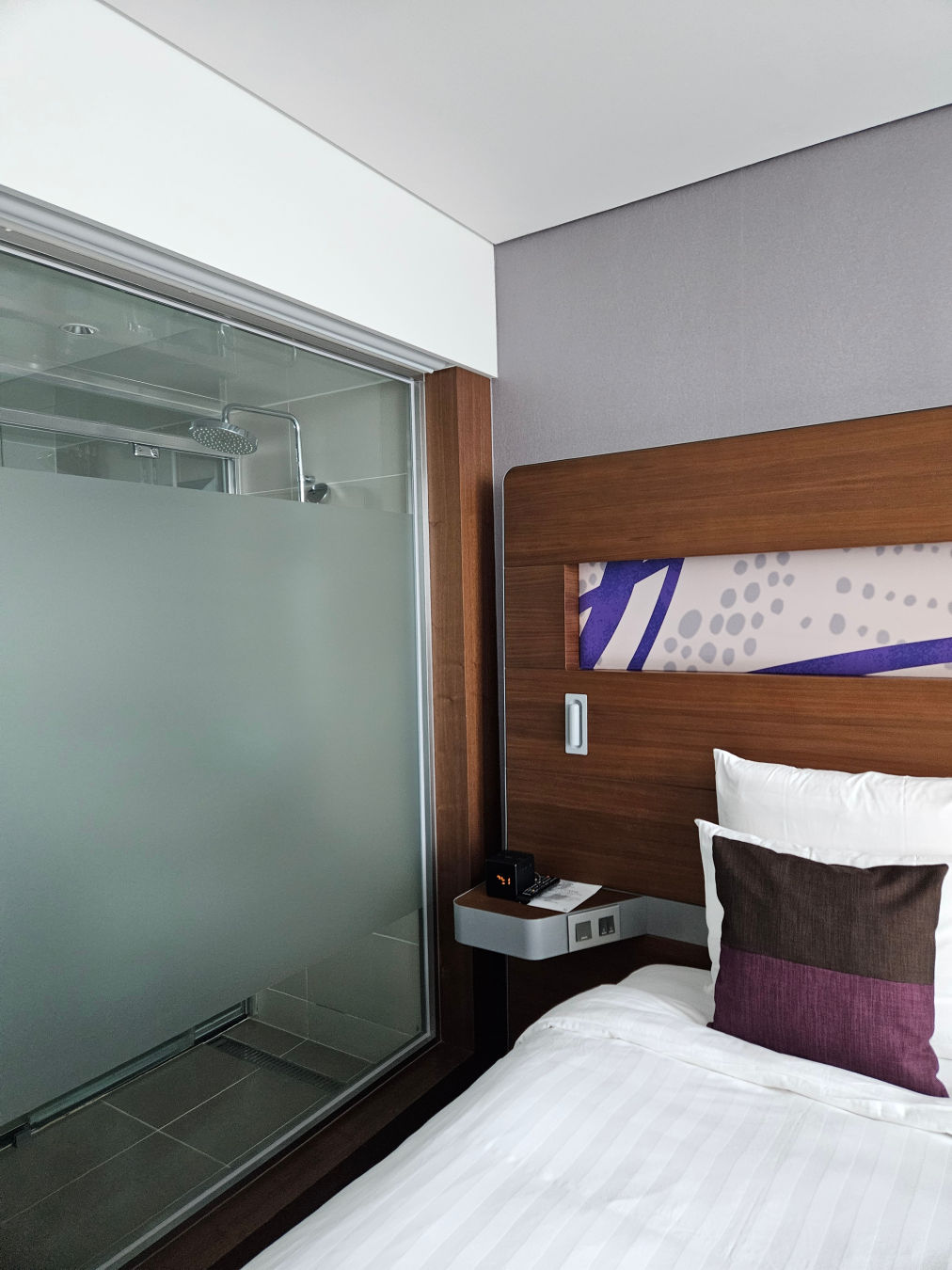 욕조는 따로 없고 유리 칸막이로 분리되어 있다.