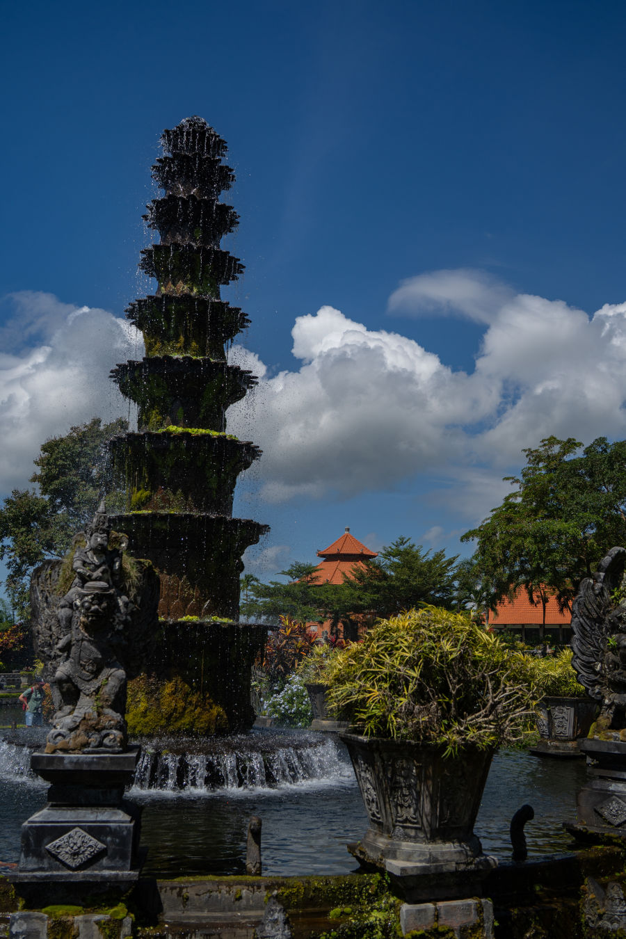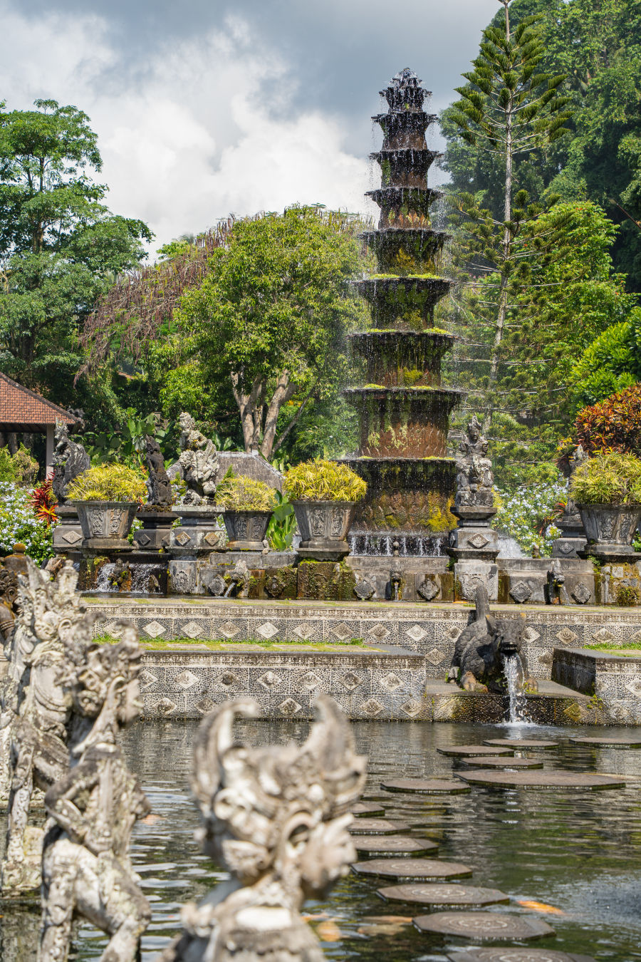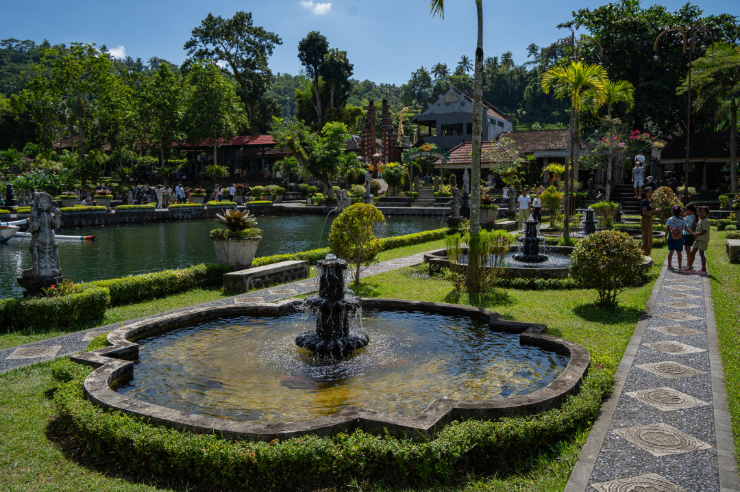 전통적인 발리식 정원과 유럽풍 석조 분수