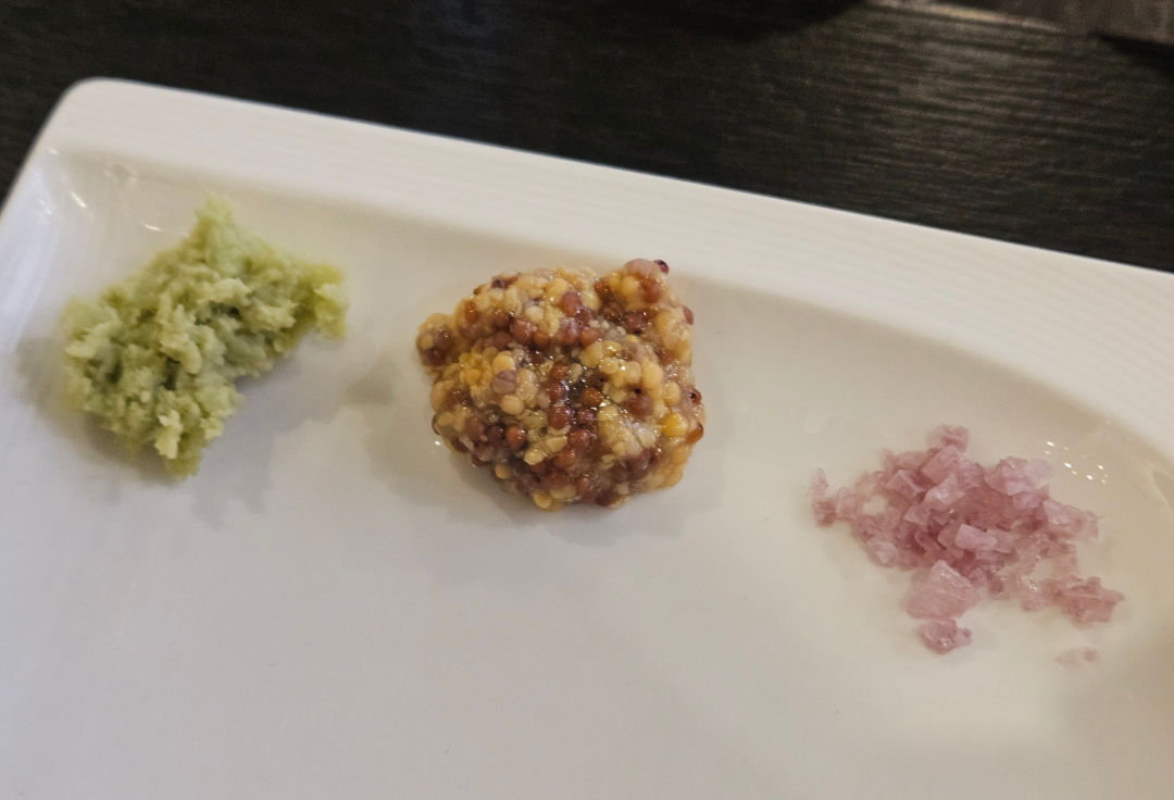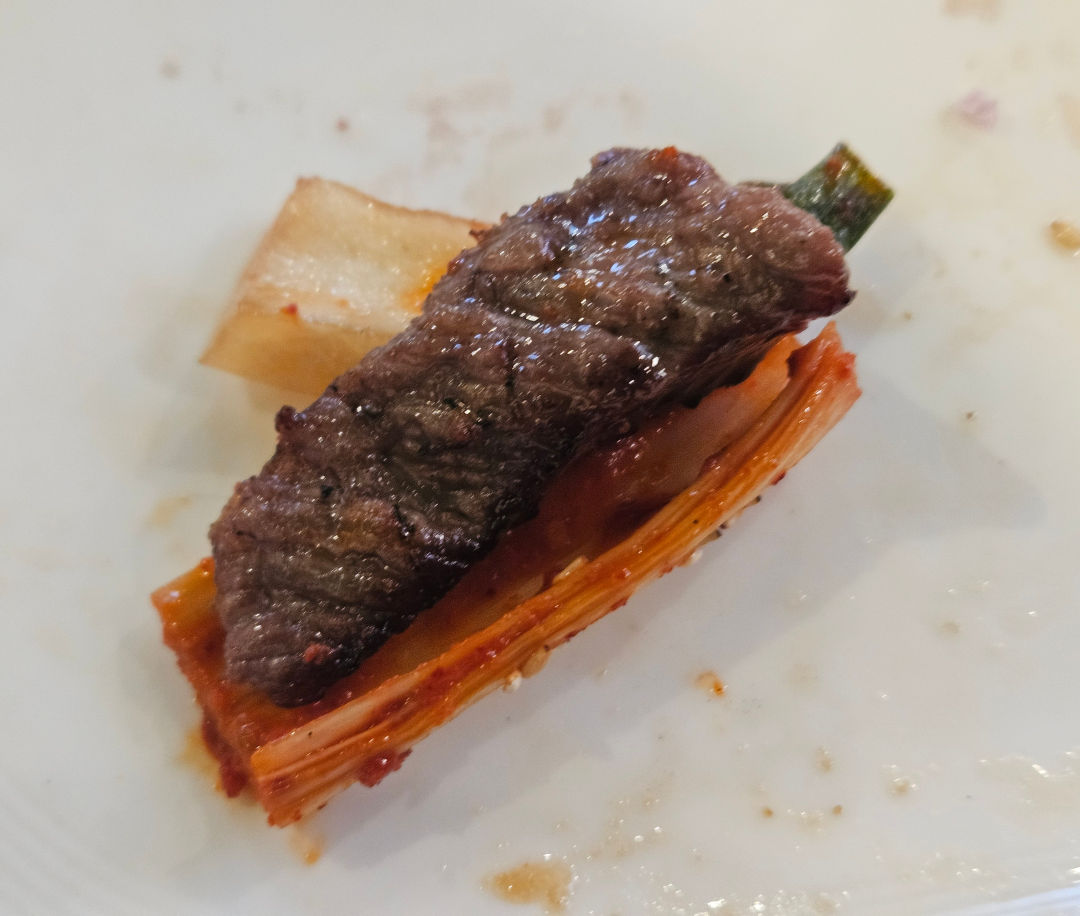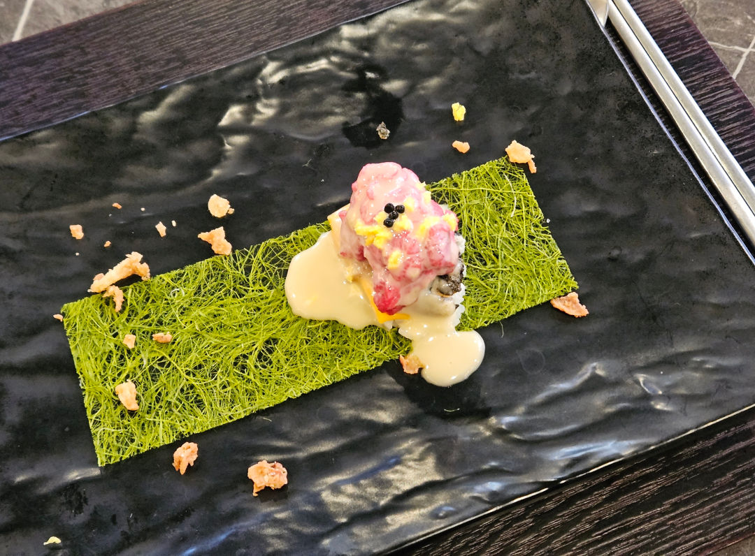 향긋한 감태 위에 다채로운 식감의 육회 초밥을 올린 요리