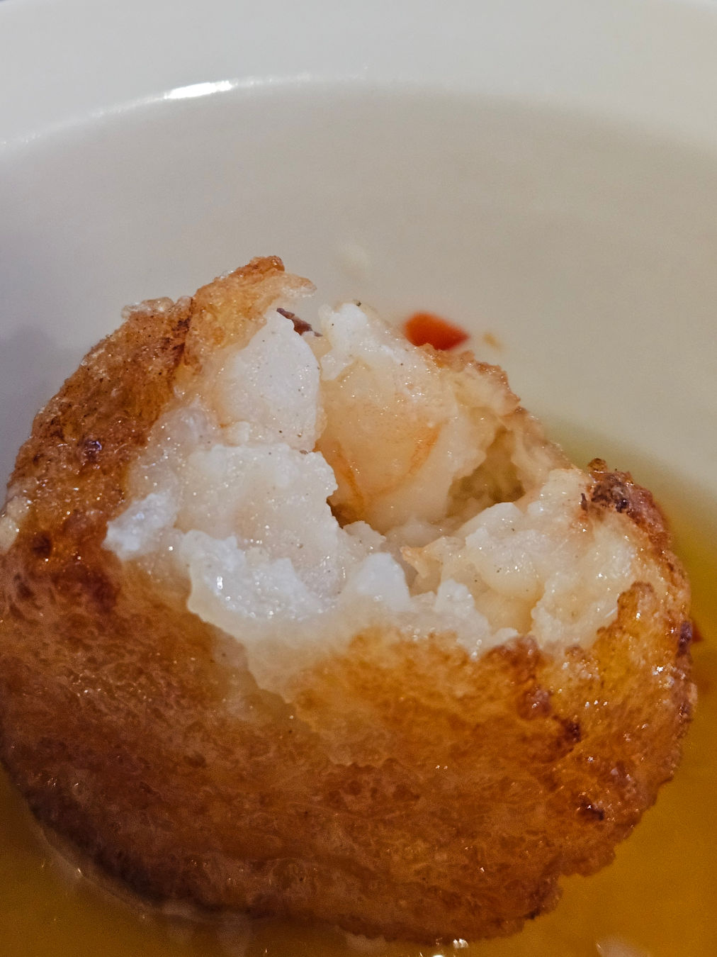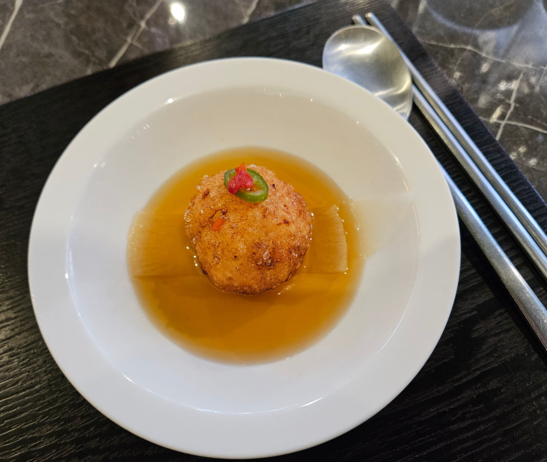 튀긴 새우 완자에 특제 간장 소스를 곁들인 요리