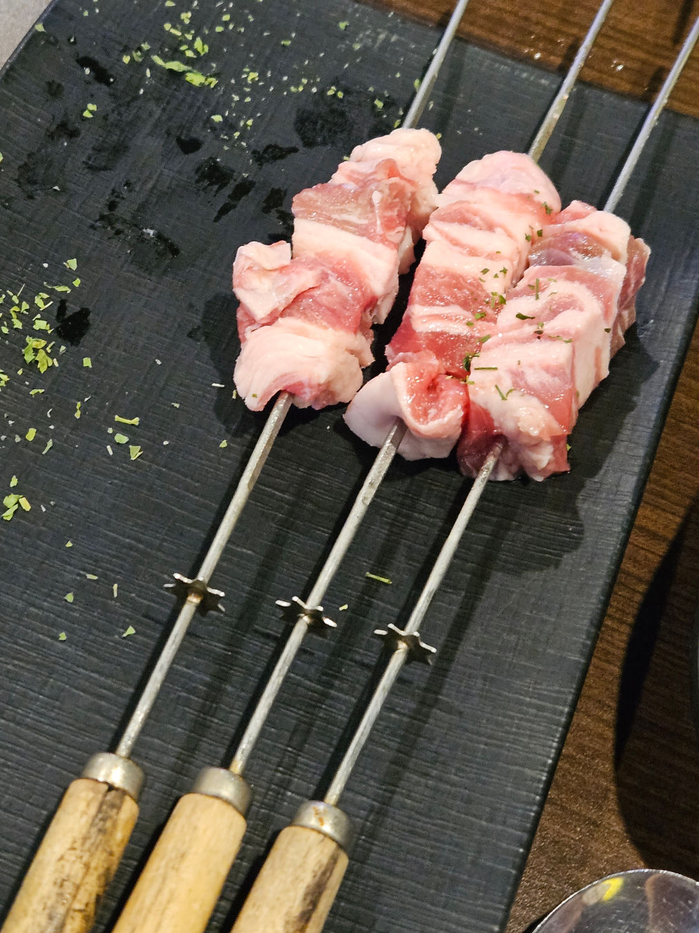 두툼한 손잡이에 꽂혀 있는 양꼬치