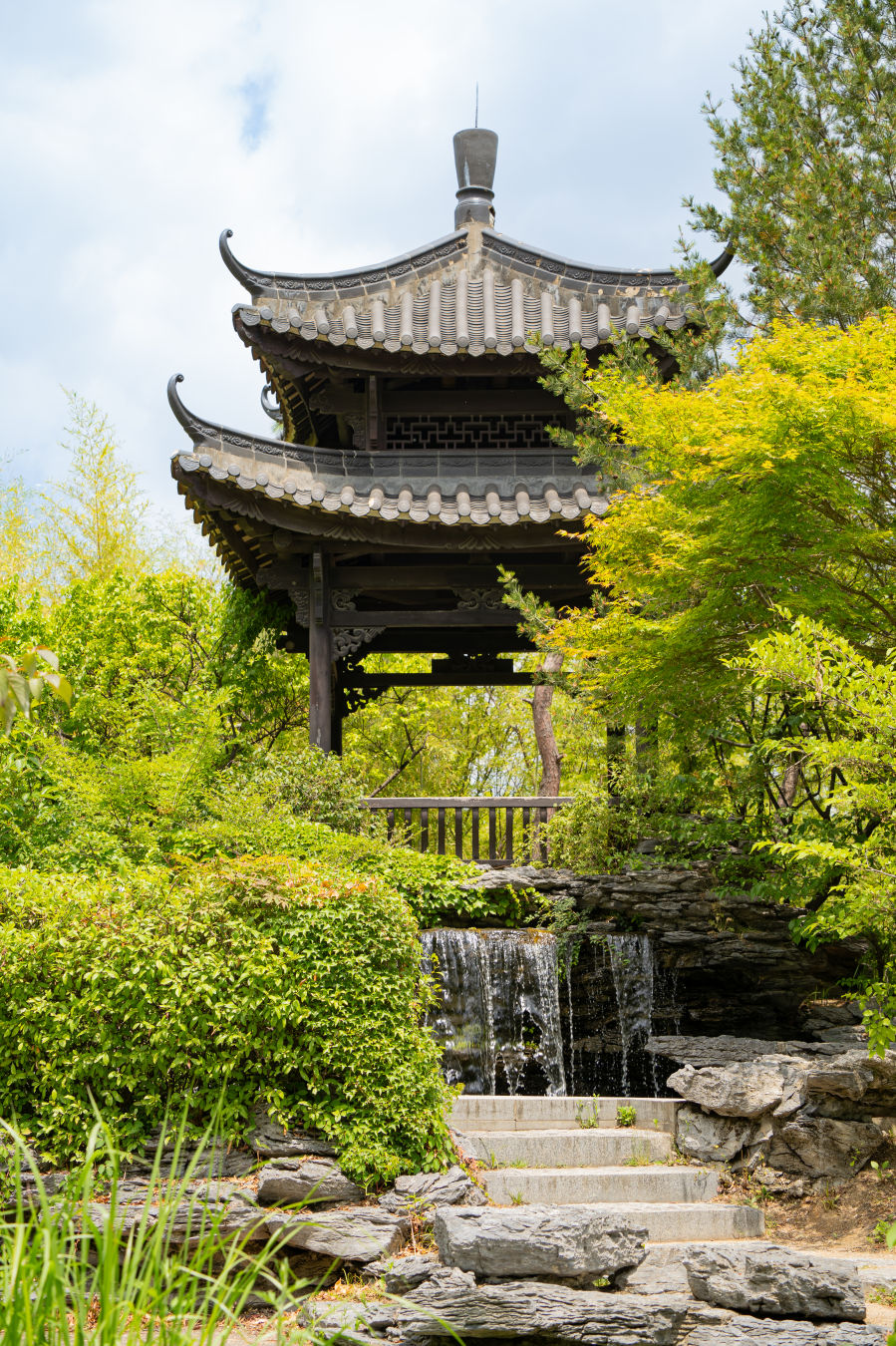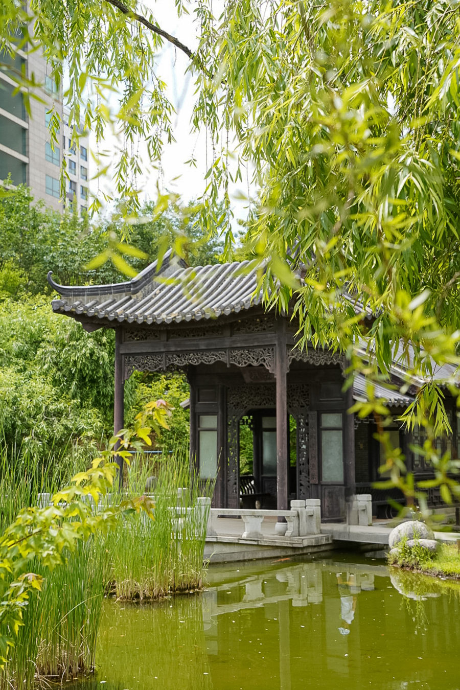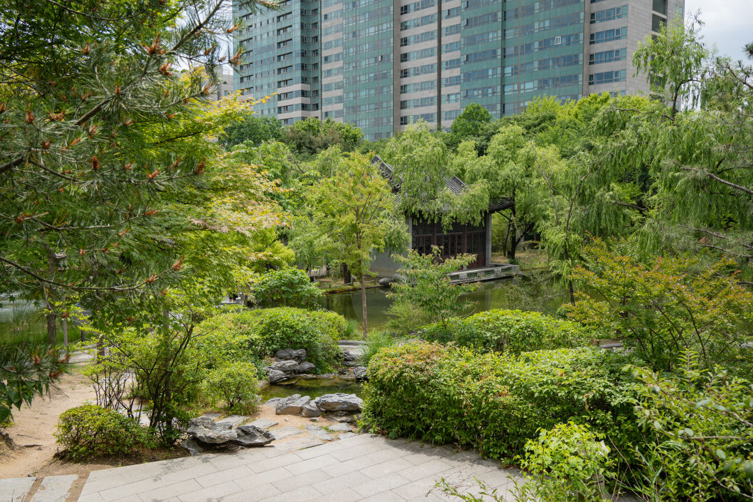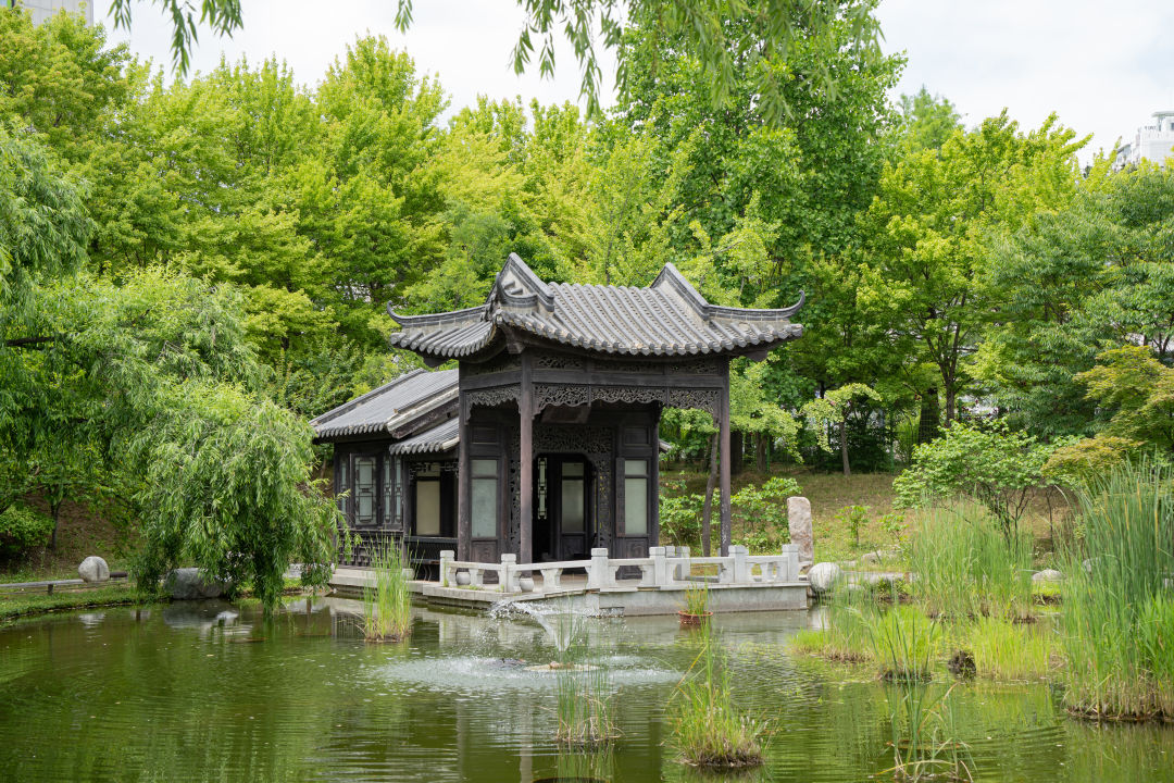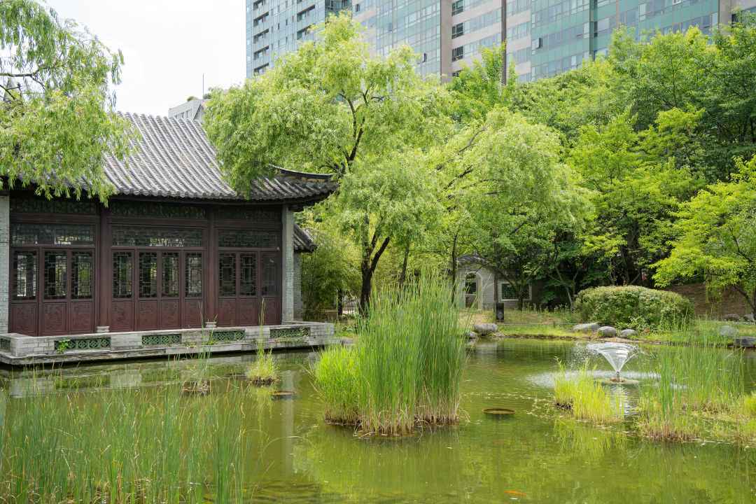 중국식 정자와 한국 전통 양식의 조경이 조화를 이루고 있다.