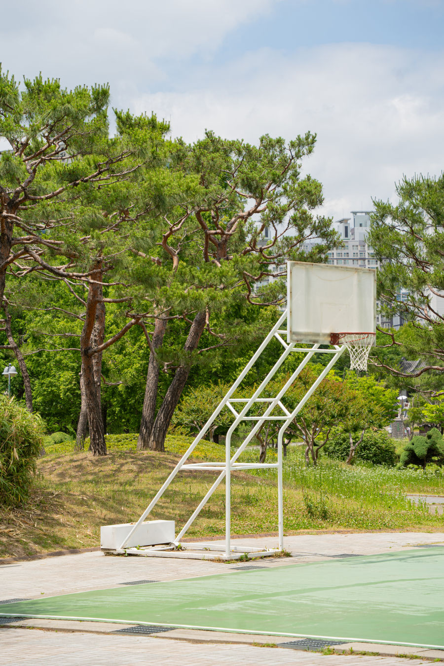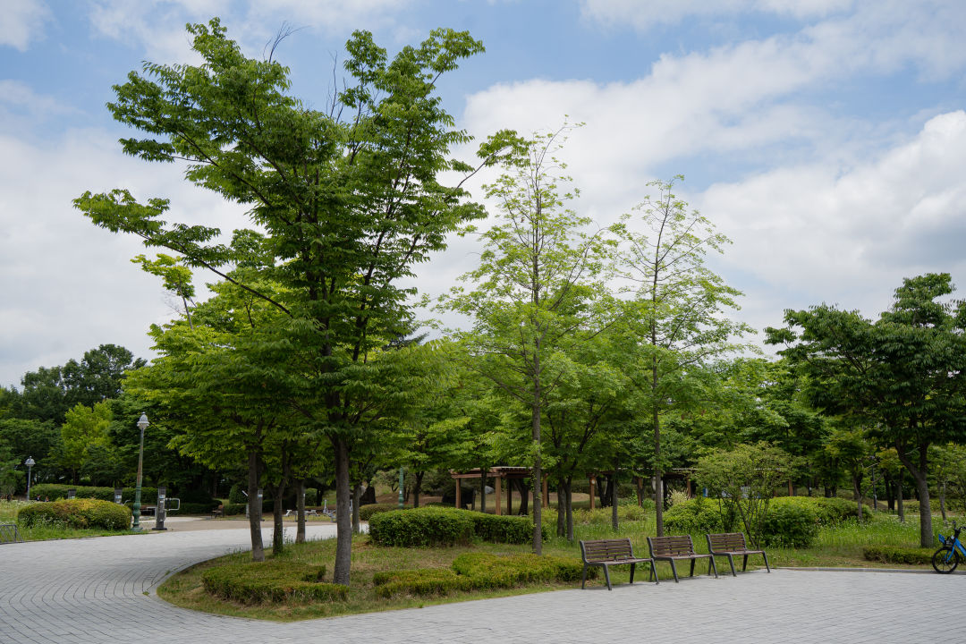 공원 맞은편에 아파트가 보이는데