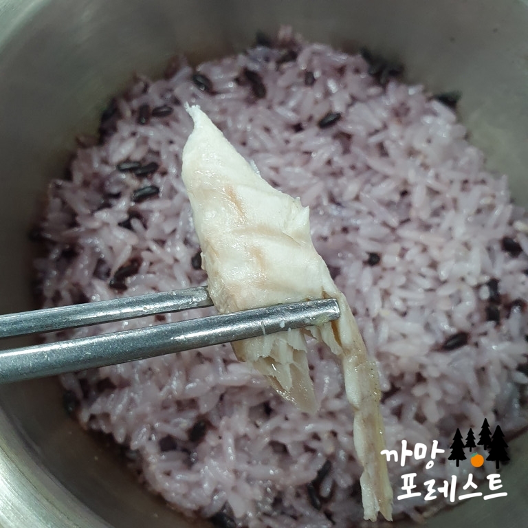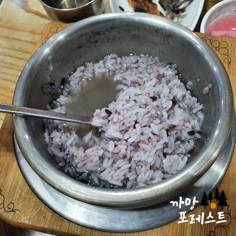 앞접시에 밥을 덜어내고, 뜨거운 물을 부어