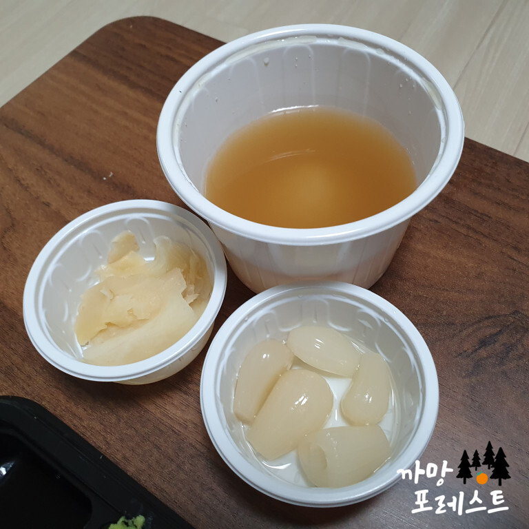 배달 올 때 락교와 생강, 된장국도 같이 옵니다.