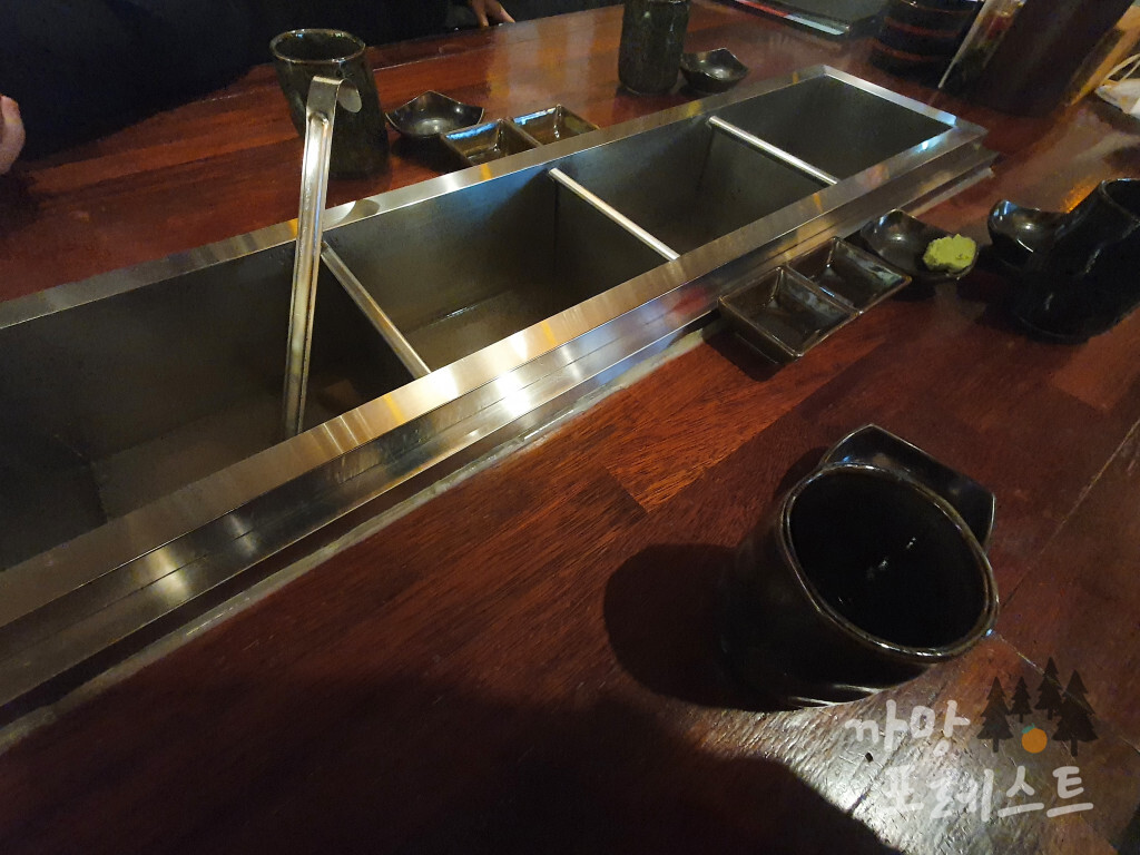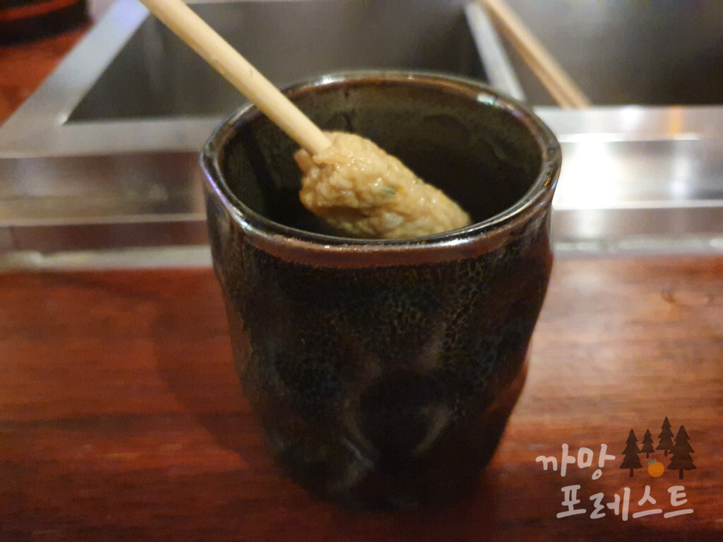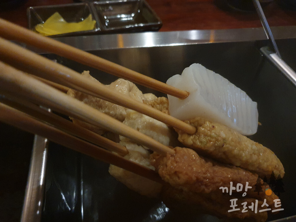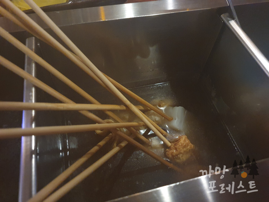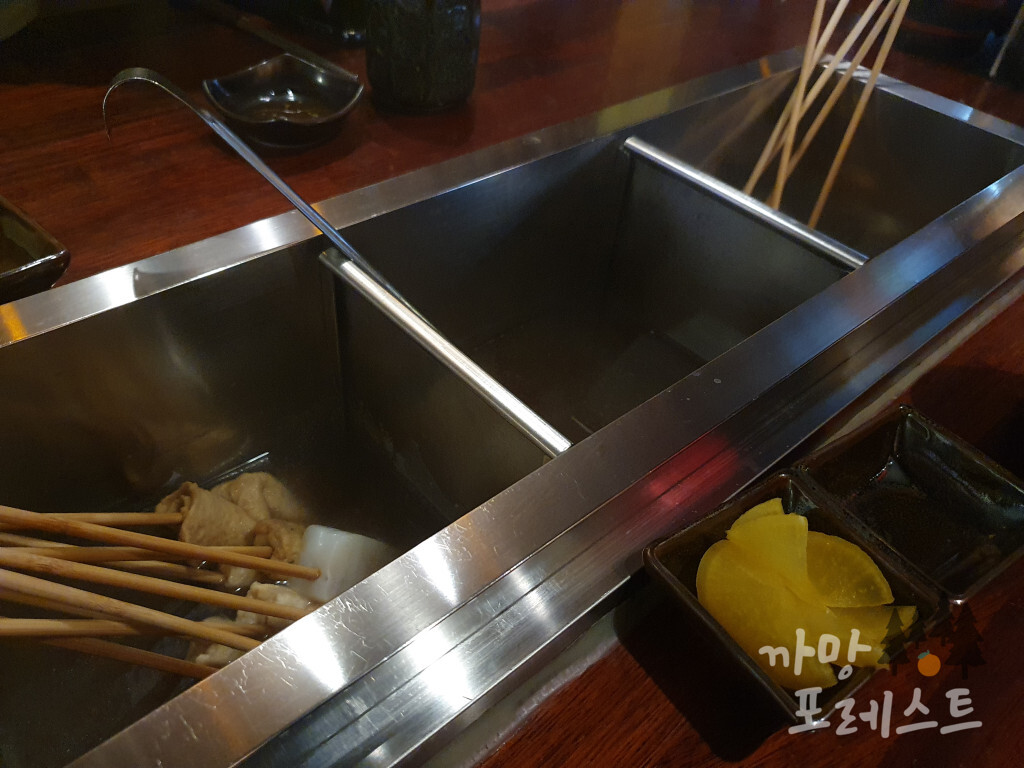 앞에 놓여 있는 국물통에 오뎅을 넣어서 먹는 구조에요~