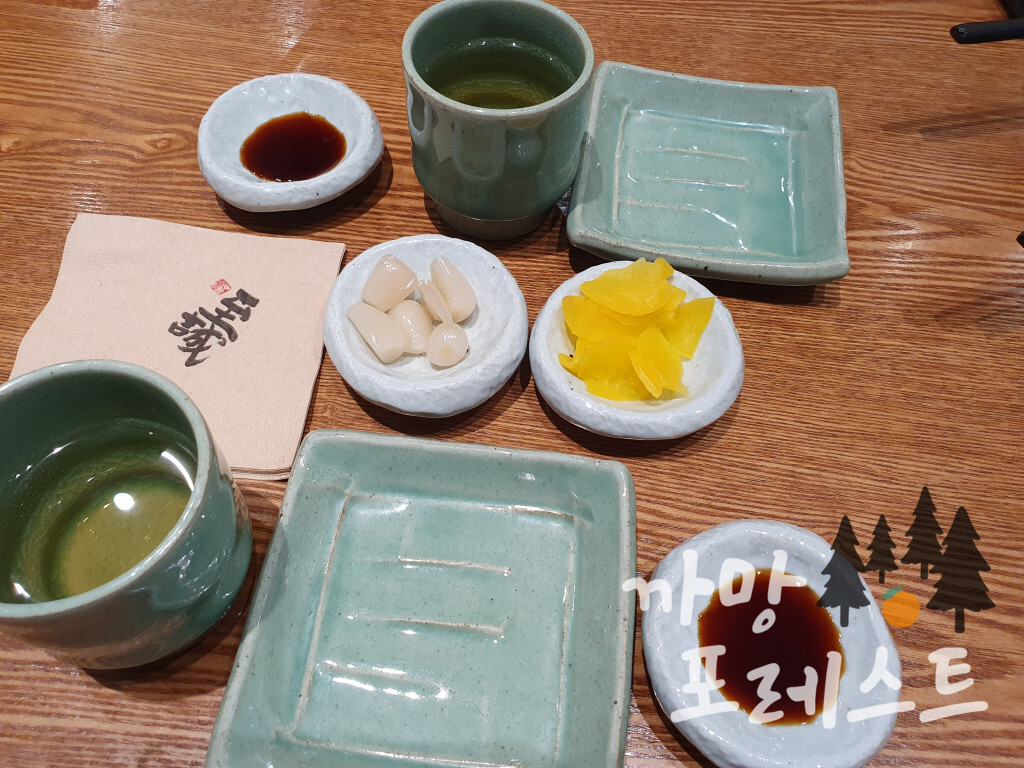 전체적으로 2~4 구성으로 수저와 간장, 물이 잘 준비되어 있다.