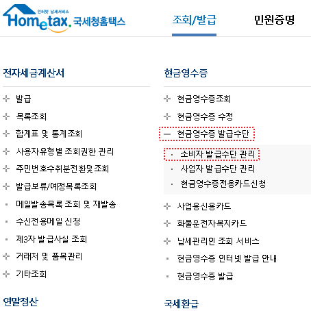② [조회/발급] - [현금영수증 발급수단] - [소비자 발급수단 관리]