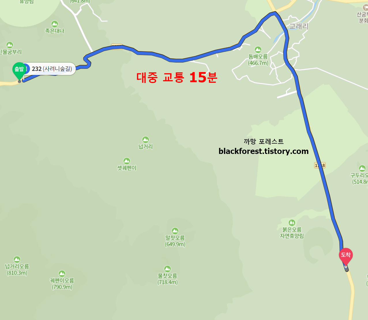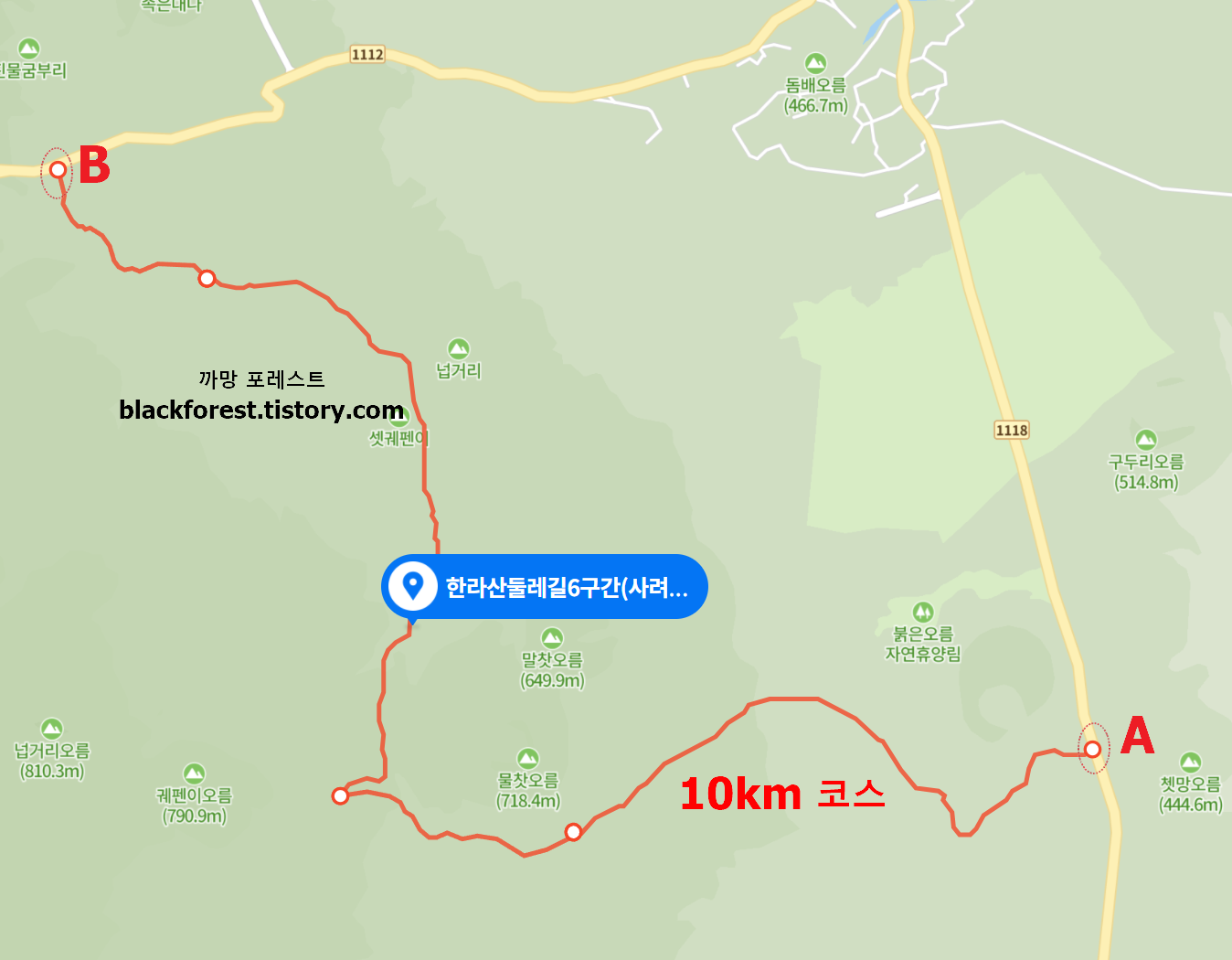 사려니숲길 입구(A)는 큰 도로가인데