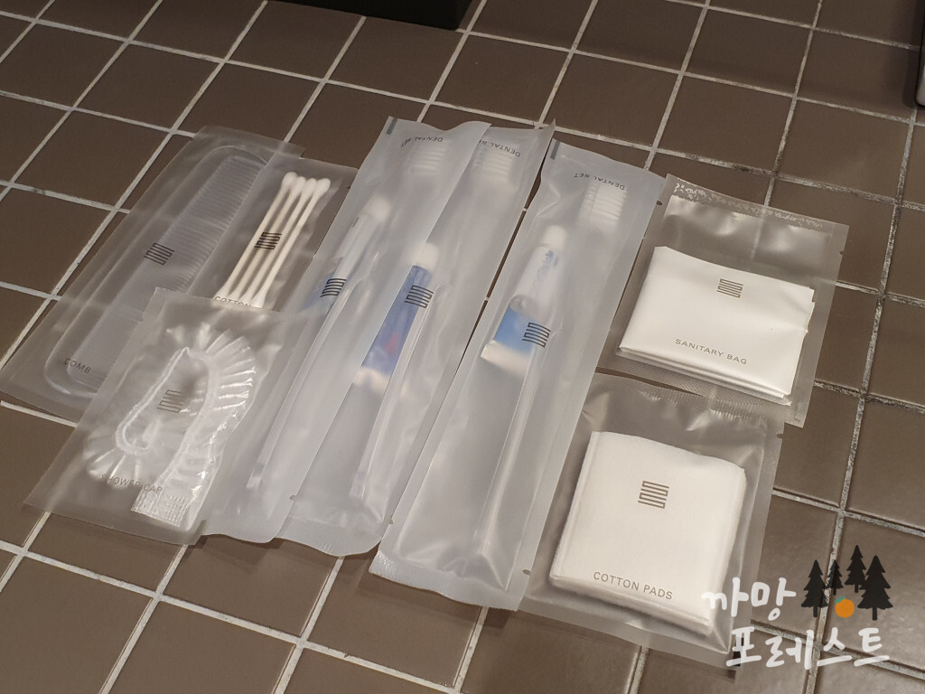 비누, 칫솔, 치약, 빗, 샤워캡, 화장솜, 면봉 등
