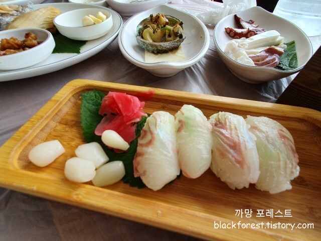 잡어 회 / 도라지 / 광어 스시 그리고 횟집에서 빠질 수 없는 콘치즈!!