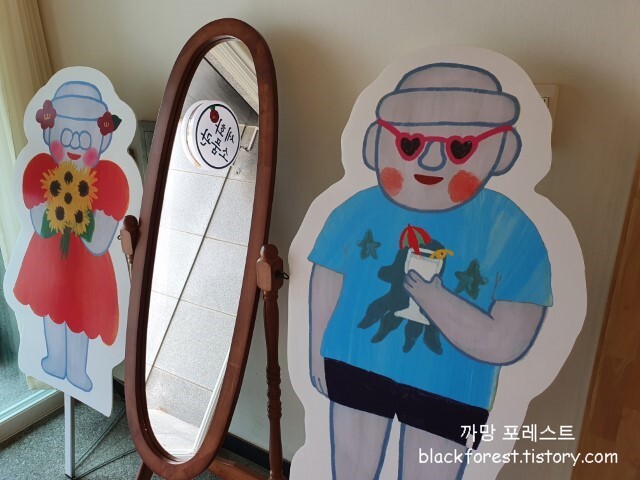 입구 바로 앞에 보이는 하르방 캐릭터와 거울