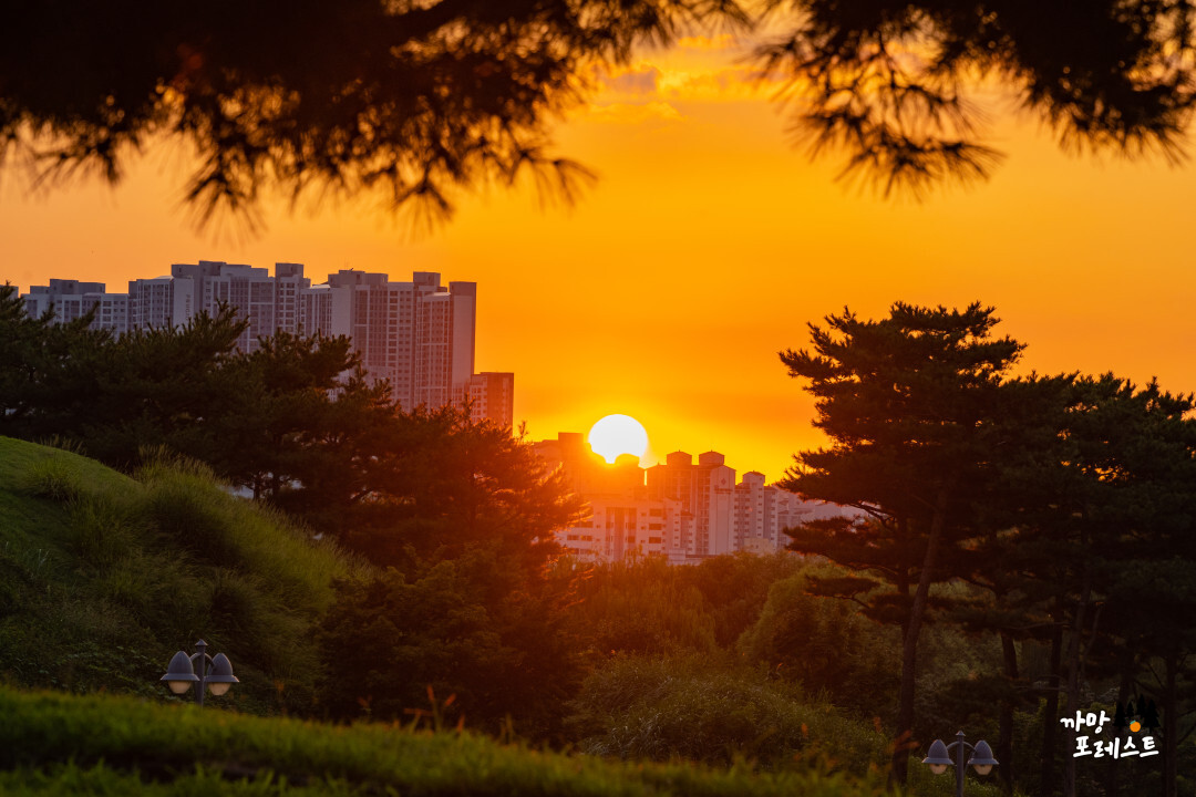 나무 사이로 떨어지는 태양